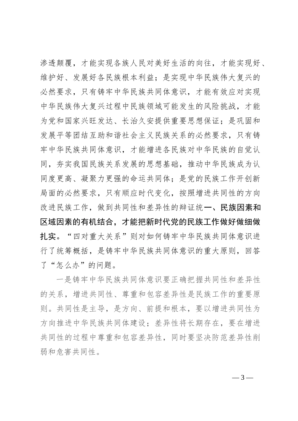 — 1 —加强民族团结 凝聚起实现民族复兴的磅礴力量党的十八大以来,以习近平同志为核心的党中央高度重视民族工作,先后召开两次中央民族工作会议,创造性地提出了“铸牢中华民族共同体意识”的重大论断,形成了习近平总书记关于加强和改进民族工作的重要思想,为做好新时代党的民族工作指明了前进方向、提供了根本遵循。一、铸牢中华民族共同体意识是重大理论创新习近平总书记关于加强和改进民族工作的重要思想将中华民族放在中国历史进程的大视野、将中华民族伟大复兴置于世界百年未有之大变局、将中华民族共同体建设嵌入人类社会发展的大进程中进行全方位、战略性审视,实现了马克思主义民族理论中国化的新飞跃,是做好新时代党的民族工作的指导思想和行动指南。从“习近平总书记关于民族工作的重要论述”到“习近平总书记关于加强和改进民族工作的重要思想”彰显了党的民族工作从理论到实践的与时俱进,以及马克思主义民族理论中国化、时代化的重大飞跃。习近平总书记关于加强和改进民族工作的重要思想科学系统回答了新时代党的民族工作面临的重大问题,形成了完整的理论体系。这一重要思想系统准确把握民族工作的时代脉搏,提出了一系列重大原创性论断,指导新时代党的民族工作取得显著成就,实践证明其具有强大的真理力量。我们应深刻认识到这一思想的重大意义,即其具有理论引领力,是马克思主义民族理论中国化的历史性飞跃;具有现实指导力,是中国特色解决民族问题正确道路的不断拓展;具有国际影响力,是我们党为世界各国解决民族问题贡献的中国智慧。二、铸牢中华民族共同体意识的丰富内涵中华民族共同体意识是一种群体性社会意识,由社会存在所决定。它的形成经历了由个体意识的特殊性到群体意识的普遍性的整合过程,是经过抽象反映、综合筛选、扬弃提炼而形成的更高层次的共同体意识。要把握新时代党的民族工作的主线,就要明了“铸牢中华民族共同体意识”是什么、为什么、怎么办。“是什么”主要包含“四个与共”,即铸牢中华民族共同体意识,就是要引导各族人民牢固树立休戚与共、荣辱与共、生死与共、命运与共的共同体理念,它诠释了中华民族共同体的深刻内涵。正如习近平总书记在 2019 年全国民族团结进步表彰大会上指出的那样,“一部中国史,就是一部各民族交融汇聚成多元一体中华民族的历史,就是各民族共同缔造、发展、巩固统一的伟大祖国的历史。”关于为什么要铸牢中华民族共同体意识,“四个必然要求”做出了精简回答,即是维护各民族根本利益的必然要求,只有铸牢中华民族共同体意识,构建起维护祖国统一和民族团结的坚固长城,各民族共同维护好国家安全和社会稳定,才能有效抵御各种极端、分裂思想的— 3 —渗透颠覆,才能实现各族人民对美好生活的向往,才能实现好、维护好、发展好各民族根本利益;是实现中华民族伟大复兴的必然要求,只有铸牢中华民族共同体意识,才能有效应对实现中华民族伟大复兴过程中民族领域可能发生的风险挑战,才能为党和国家兴旺发达、长治久安提供重要思想保证;是巩固和发展平等团结互助和谐社会主义民族关系的必然要求,只有铸牢中华民族共同体意识,才能增进各民族对中华民族的自觉认同,夯实我国民族关系发展的思想基础,推动中华民族成为认同度更高、凝聚力更强的命运共同体;是党的民族工作开创新局面的必然要求,只有顺应时代变化,按照增进共同性的方向改进民族工作,做到共同性和差异性的辩证统一、民族因素和区域因素的有机结合,才能把新时代党的民族工作做好做细做扎实。“四对重大关系”则对如何铸牢中华民族共同体意识进行了统筹概括,是铸牢中华民族共同体意识的重大原则,回答了“怎么办”的问题。一是铸牢中华民族共同体意识要正确把握共同性和差异性的关系,增进共同性、尊重和包容差异性是民族工作的重要原则。共同性是主导,是方向、前提和根本,要以增进共同性为方向推进中华民族共同体建设;差异性将长期存在,要在增进共同性的过程中尊重和包容差异性,同时要坚决防范差异性削弱和危害共同性。二是要正确把握中华民族共同体意识和各民族意识的关系厘清二者的层次关系,二者可以并存不悖,但不...