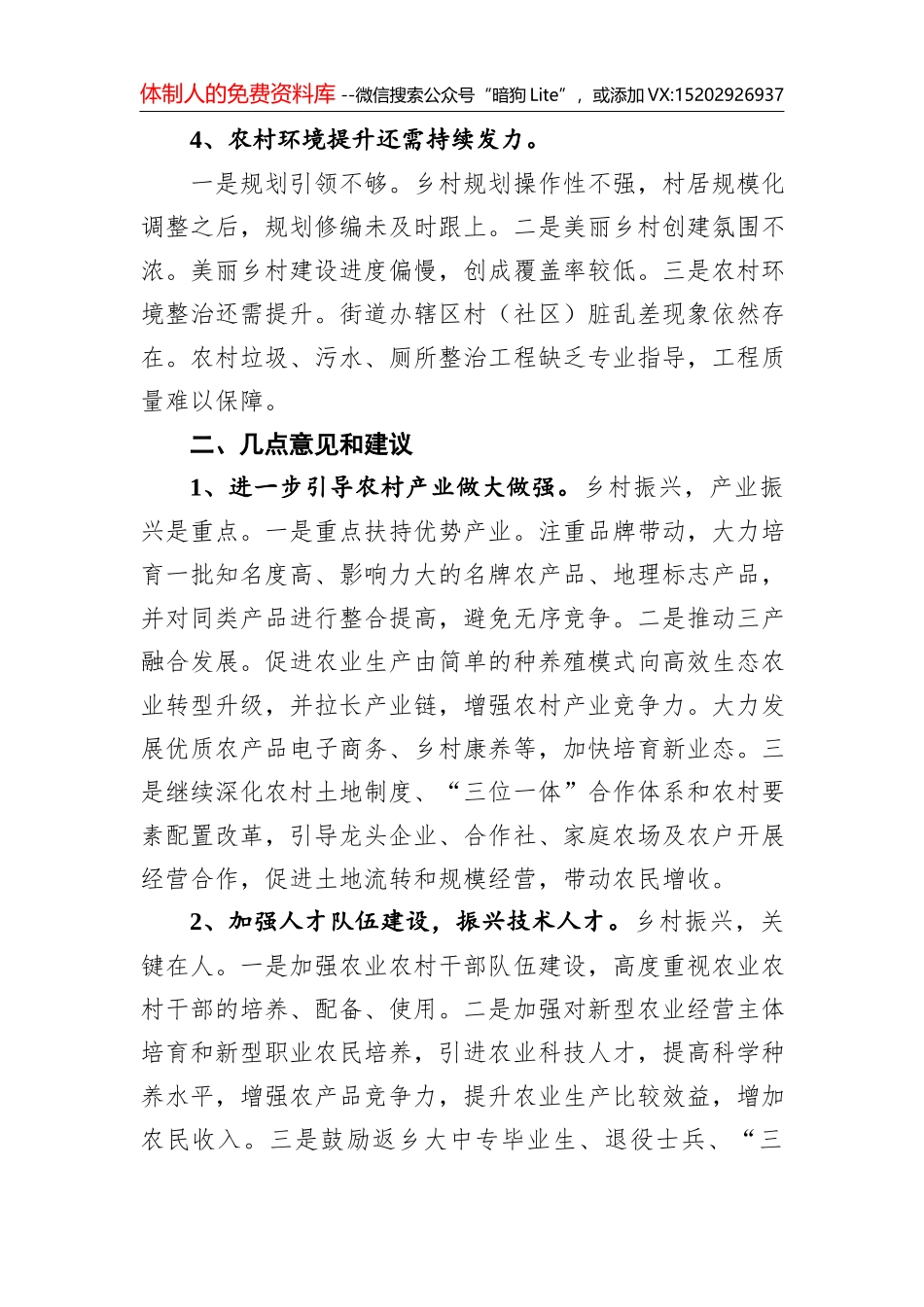 体制人的免费资料库 --微信搜索公众号“暗狗 Lite”,或添加 VX:15202926937牧野区人大代表乡村振兴调研报告郝同祥农村稳则天下安,农业兴则基础劳,农民富则国家盛。党的十九大报告提出“农业、农村、农民问题是关系国家民生的根本问题,要坚持农业农村优先发展,实施乡村振兴战略”,并就“乡村振兴”明确提出了“产业兴旺、生态宜居乡风文明、治理有效、生活富裕”的乡村发展总体要求,将其提升到战略高度,写入党章,为农业农村改革发展指明了航向。一、存在主要问题:深入实施乡村振兴发展战略,必须以问题为导向,找出乡村发展的差距所在,补齐短板,才能不断缩小城乡差距,才能逐个问题、逐个环节地解决农村发展不平衡,不充分的矛盾。通过对制约农村农业发展的相关问题进行深入了解,总的来说,我街道在乡村振兴上面临的问题主要有以下几个方面:1、乡村特色产业不强。我街道下辖村(社区)主要产业为农作物种植,今年来以“绿色牧野、美丽牧野”为目标,对种植业结构进行调整推动调整农作物,向花卉苗木等种植项目进行转移。积极对接农业种植大户,对区域内进行连片土地流转,统一种植、体制人的免费资料库 --微信搜索公众号“暗狗 Lite”,或添加 VX:15202926937统一管理。一方面避免农户的重视乱象,一方面增加农户收入。但农村产业仍然不大不强,缺少大而强的农业龙头企业三产融合程度低。在实施乡村振兴战略过程中,农村产业如何形成规模效应、提高社会化保障水平,以及通过一二三产业融合发展,利用“互联网+”等新技术、新模式、新业态促进农村产业振兴,值得思考与重视。2、技术人才支撑不足。通过调查了解,农村在家从事农业生产的大多是 50 岁以上人口,从事农业生产的青壮年较少。务农人员文化程度一般以初中及以下文化程度为主。农业新技术新产业新模式推广难,不利于农业现代化发展。再加上教育与社会心理的影响,制约乡村发展。近几十年来,无论是家庭教育、学校教育,还是社会教育,都是围绕“远离农村、远离农业”展开的,“不好好学习,就当农民”,是乡村家长、教师激励孩子学习动机的最有效口号。人们骨子里潜移默化的渗透着一种观念,没出息的人才当农民,甚至只要和农业、农村有关的人与事都会“低人一等”,这样的说法虽然略显极端,但却是当前社会上的一种普遍观念。3、存在“等靠要”的思想。在调研过程中,部分村民觉得自己年纪大了,不想做农活了,希望政府供养他们。一些人觉得医疗费用太高,政府最好全部报销费用。部分村民存在“等靠要”的思想,遇到困难和问题习惯于等政策、靠扶持、要条件,过度依赖政府缺乏艰苦奋斗、积极进取的精神。体制人的免费资料库 --微信搜索公众号“暗狗 Lite”,或添加 VX:152029269374、农村环境提升还需持续发力。一是规划引领不够。乡村规划操作性不强,村居规模化调整之后,规划修编未及时跟上。二是美丽乡村创建氛围不浓。美丽乡村建设进度偏慢,创成覆盖率较低。三是农村环境整治还需提升。街道办辖区村(社区)脏乱差现象依然存在。农村垃圾、污水、厕所整治工程缺乏专业指导,工程质量难以保障。二、几点意见和建议1、进一步引导农村产业做大做强。乡村振兴,产业振兴是重点。一是重点扶持优势产业。注重品牌带动,大力培育一批知名度高、影响力大的名牌农产品、地理标志产品,并对同类产品进行整合提高,避免无序竞争。二是推动三产融合发展。促进农业生产由简单的种养殖模式向高效生态农业转型升级,并拉长产业链,增强农村产业竞争力。大力发展优质农产品电子商务、乡村康养等,加快培育新业态。三是继续深化农村土地制度、“三位一体”合作体系和农村要素配置改革,引导龙头企业、合作社、家庭农场及农户开展经营合作,促进土地流转和规模经营,带动农民增收。2、加强人才队伍建设,振兴技术人才。乡村振兴,关键在人。一是加强农业农村干部队伍建设,高度重视农业农村干部的培养、配备、使用。二是加强对新型农业经营主体培育和新型职业农民培养,引进农业科技人才,提高科学种养水平,增强农产品竞争力,提升农业生产比较效益,增加农民收入。三是鼓励返乡大中专毕业生、退役士兵、“...